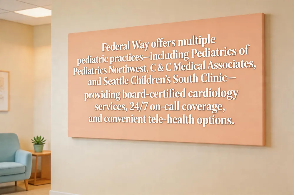 Seattle Children’s Cardiology in Federal Way – The South Clinic at 34920 Enchanted Pkwy S delivers pediatric cardiac services—echocardiograms, ECGs, rhythm monitoring, and assessment. Cardiologists provide 24/7 on‑call coverage; new‑patient referrals are scheduled within 1–2 weeks. Call 253‑838‑5878 for appointments.