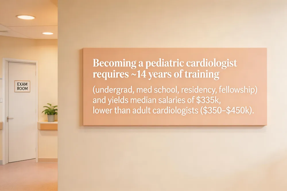 It typically requires 14 years of post‑secondary education: 4 years undergraduate, 4 years medical school, a 3‑year pediatric residency, and a 3‑year pediatric cardiology fellowship.
