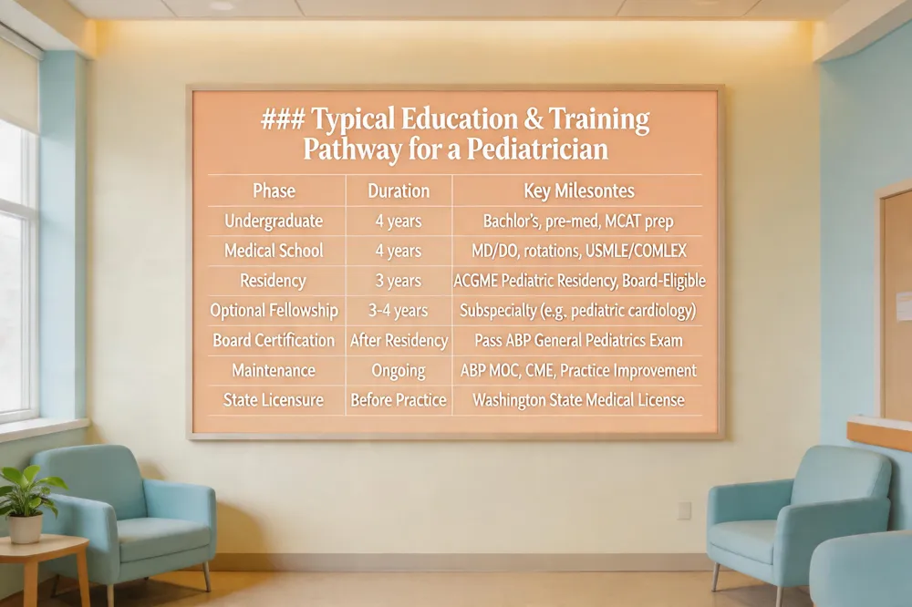 Board certification is the gold‑standard credential that tells families a pediatrician has gone beyond state licensure, completed an accredited three‑year residency, and passed the rigorous American Board of Pediatrics (ABP) examinations. This process guarantees up‑to‑date knowledge of preventive care, immunizations, developmental screening, and management of complex conditions such as asthma, diabetes, and pediatric heart disease. The training pathway begins with a four‑year undergraduate degree, four years of medical school, and a three‑year pediatric residency; subspecialists such as pediatric cardiologists add an additional 3‑4‑year fellowship and separate ABP subspecialty certification. In Federal Way, Washington, families benefit from practices that employ board‑certified physicians and offer services ranging from routine well‑child visits and nutrition counseling to on‑site cardiac imaging, telehealth sick‑visit appointments, and 24‑hour urgent‑care lines. Choosing a board‑certified pediatrician ensures expertise, continuity of care, and seamless referrals to pediatric cardiology specialists when heart‑related concerns arise, giving parents confidence that their child’s health is managed by a clinician committed to lifelong learning and evidence‑based practice. Most Federal Way clinics provide online scheduling, walk‑in slots for same‑day sick visits, and after‑hours nurse lines.