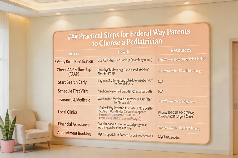 For families in Federal Way, start by identifying practices that list board‑certified physicians—such as the Center for Pediatric Medicine, Mary Bridge Children’s Outpatient Center, or Seattle Children’s South Clinic. Use the ABP online verification tool or the AAP “Find a Pediatrician” directory to confirm status, check for FAAP fellowship, and review any subspecialty certification in pediatric cardiology. Schedule a pre‑visit tour or virtual meet‑and‑greet to assess office hours, same‑day sick‑visit availability, telehealth options, and insurance compatibility.