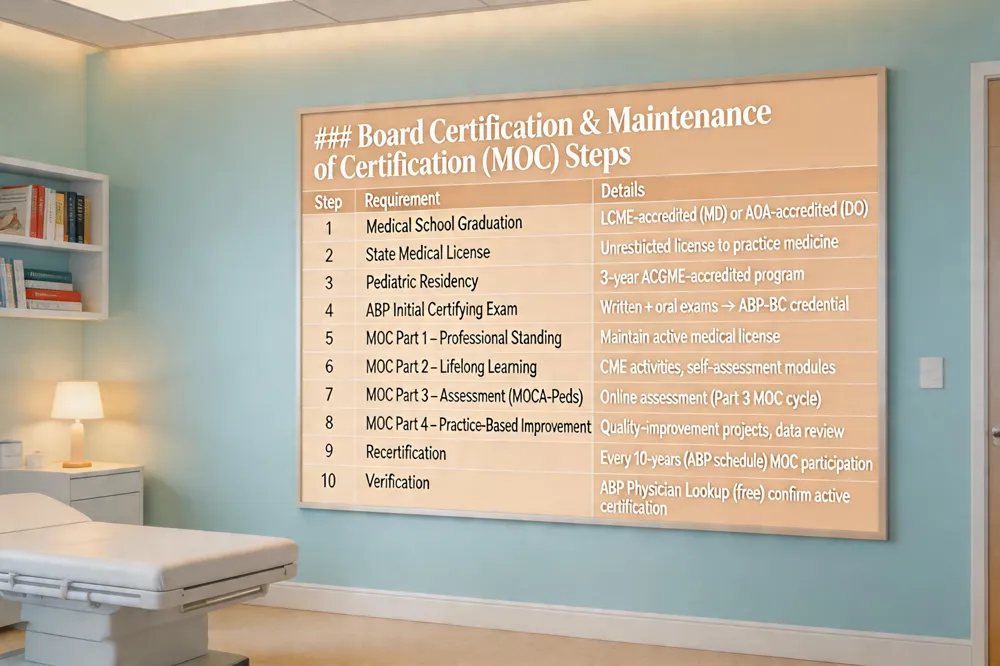 Choosing a pediatrician who is board‑certified gives families confidence that the doctor has met rigorous national standards. Step‑by‑step board certification begins with graduation from an LCME‑accredited medical school (or AOA‑accredited for DOs), obtaining an unrestricted state medical license, and completing a three‑year ACGME‑accredited pediatric residency. After residency, the physician must pass the American Board of Pediatrics (ABP) General Pediatrics Initial Certifying Examination to earn the ABP‑BC credential.