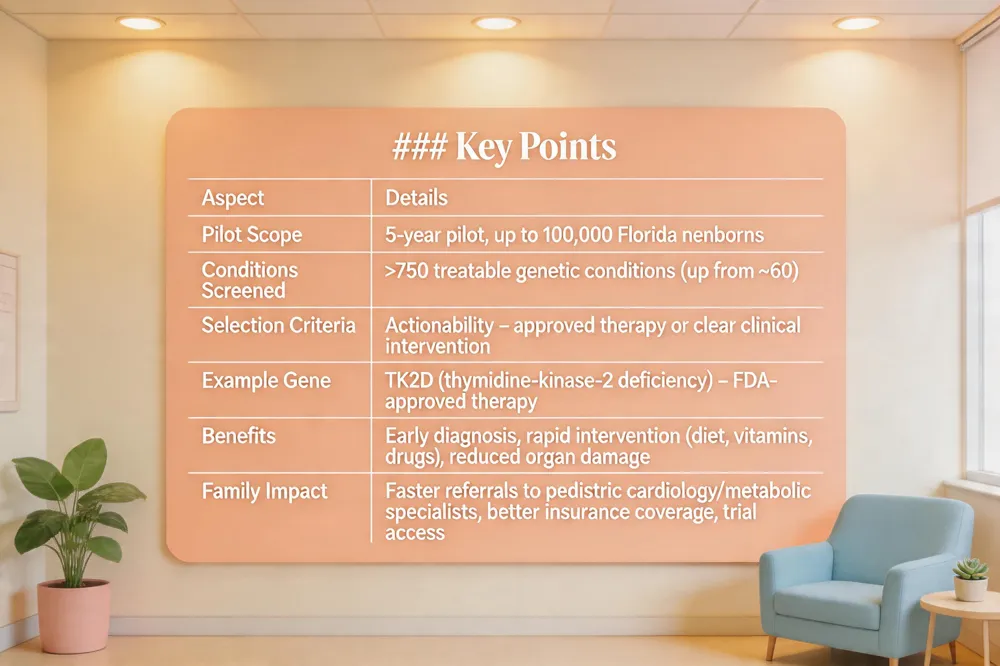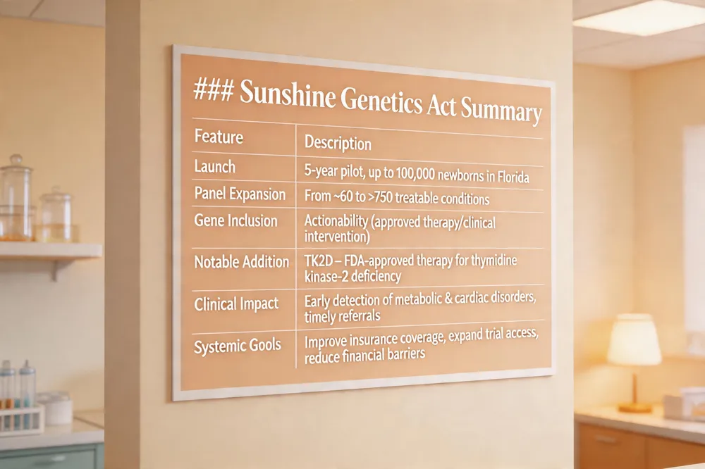 The Sunshine Genetics Act launches a five‑year pilot to sequence genomes of up to 100,000 Florida newborns, signed by Governor Ron DeSantis, launches a five‑year pilot that will sequence the genomes of up to 100,000 newborns in Florida. Instead of the current 60‑condition panel, the Pilot screens for >750 treatable genetic conditions, expanding beyond current 60‑condition panel. Using the Actionability (approved therapy or clear intervention) is primary criterion for gene inclusion, the program selects genes. For recent FDA-approved therapy for thymidine kinase 2 deficiency added to screening list; illustrates this approach; the new therapy will be added to the list, allowing early dietary or medication‑based treatment that can prevent irreversible neurologic damage. For families, the expanded genetic data promises earlier detection of metabolic diseases and congenital heart defects, paving the way for timely referrals to pediatric cardiology and metabolic specialists. The program also seeks to Program aims to improve insurance coverage for expensive therapies and access to clinical trials, reducing financial barriers and improving access to cutting‑edge care.