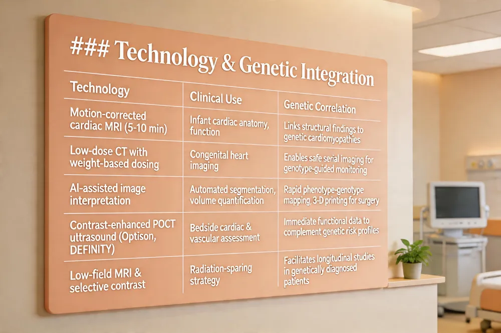 | Motion‑corrected cardiac MRI (5‑10 min) | Infant cardiac anatomy, function | Links structural findings to genetic cardiomyopathies |
