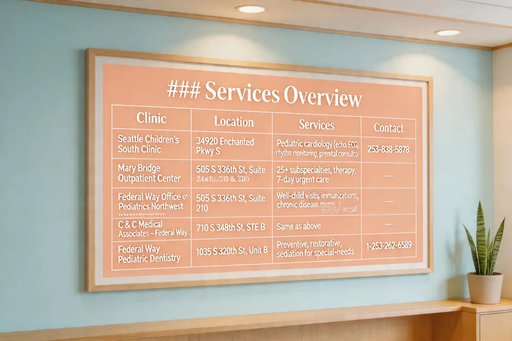 Seattle Children’s South Clinic in Federal Way brings the expertise of Seattle Children’s Hospital to the south‑King County community. Located at 34920 Enchanted Pkwy S, the clinic offers a full pediatric cardiology program—echocardiograms, ECGs, rhythm monitoring, and prenatal cardiac consultations—through the Seattle Children’s Heart Center. Call 253‑838‑5878 to schedule an appointment; new patients are typically seen within one to two weeks after referral, and urgent‑care cardiology hours extend into the evening on weekdays.