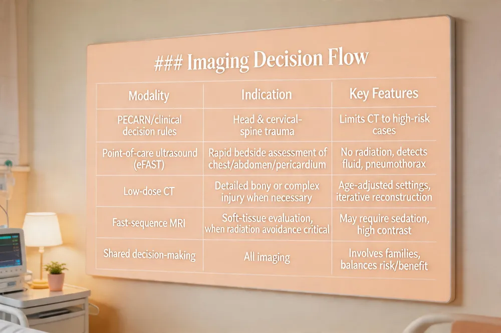 When a child arrives in the emergency department after an injury, clinicians follow evidence‑based clinical decision rules—such as the PECARN head‑trauma and cervical‑spine algorithms—to decide which imaging studies are truly needed. These rules reserve CT for high‑risk features (e.g., Glasgow Coma Scale < 15, worsening neurologic signs, or concerning mechanism) and favor plain radiographs or ultrasound first.
