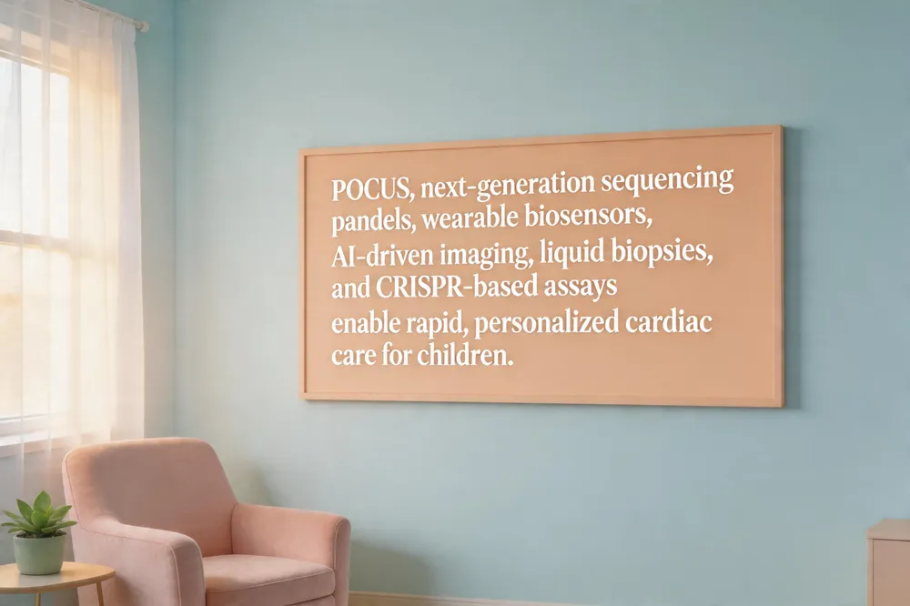Point‑of‑care ultrasound (POCUS) now lets pediatricians quickly view heart, lung and abdominal structures without radiation. Next‑generation sequencing (NGS) panels identify genetic causes of congenital heart defects and metabolic disorders within days, guiding personalized treatment. Wearable biosensors continuously track heart rate, oxygen saturation and breathing, alerting clinicians to arrhythmias or early heart‑failure signs. AI‑driven analysis of echocardiograms and MRI speeds interpretation and uncovers subtle anomalies. Tele‑medicine platforms provide remote cardiac monitoring for families in Federal Way, Washington, expanding specialty access. Liquid biopsies (cell‑free DNA) and CRISPR‑based assays (SHERLOCK, DETECTR) are emerging as minimally invasive tools for tumor detection and cardiomyopathy mutation screening.