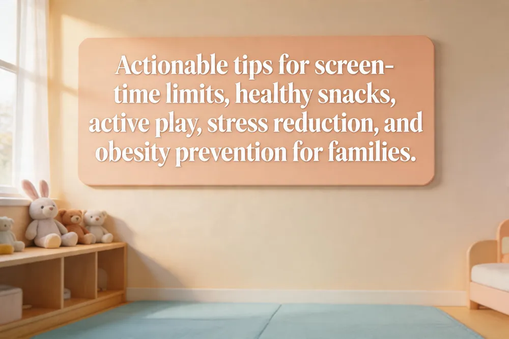- Childhood obesity prevention strategies: model balanced meals, limit sugary drinks, ensure ≥60 minutes of daily activity, restrict screen time, maintain consistent sleep, and create a supportive home environment.