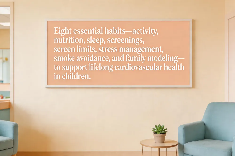 Eight essential habits for children form the foundation of lifelong cardiovascular health: 1) ≥ 60 minutes of daily moderate‑to‑vigorous activity (play, sports, family walks); 2) A balanced, "Super Fuel" diet rich in fruits, vegetables, whole grains, lean proteins, low‑fat dairy, nuts, and seeds while limiting sugary drinks, processed foods, added sugars, saturated and trans fats; 3) Age‑appropriate sleep—9‑12 hours for school‑age kids, 8‑10 hours for teens—supported by a consistent bedtime routine and a cool, dark, screen‑free environment; 4) Routine pediatric check‑ups for growth, blood pressure, cholesterol, and BMI monitoring; 5) Limited recreational screen time (≤1 hour for younger children, age‑appropriate limits for older kids); 6) Stress‑management techniques such as deep‑breathing, active play, and open communication; 7) Avoidance of tobacco smoke and nicotine products; 8) Family modeling of healthy eating, activity, and sleep habits. The American Heart Association’s Life’s Essential 8 for Kids expands these into eight evidence‑based pillars—nutrition, activity, sleep, healthy weight, blood‑pressure, cholesterol, blood‑sugar, and tobacco avoidance—providing clear, actionable guidance for parents and pediatric providers.
