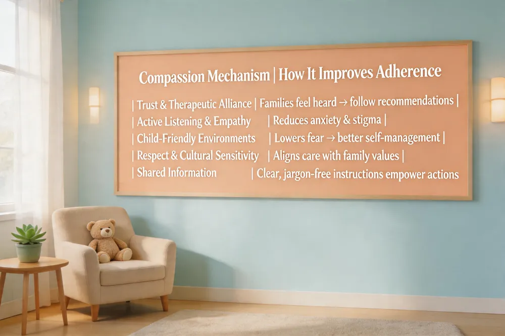 Compassionate care builds a therapeutic alliance rooted in trust; when children and families feel heard, they are more likely to follow treatment plans. Active listening and empathetic communication create a sense of partnership, reducing anxiety and stigma that often drive non‑adherence. Atraumatic, child‑friendly environments further lower fear, enabling children to engage in self‑management.