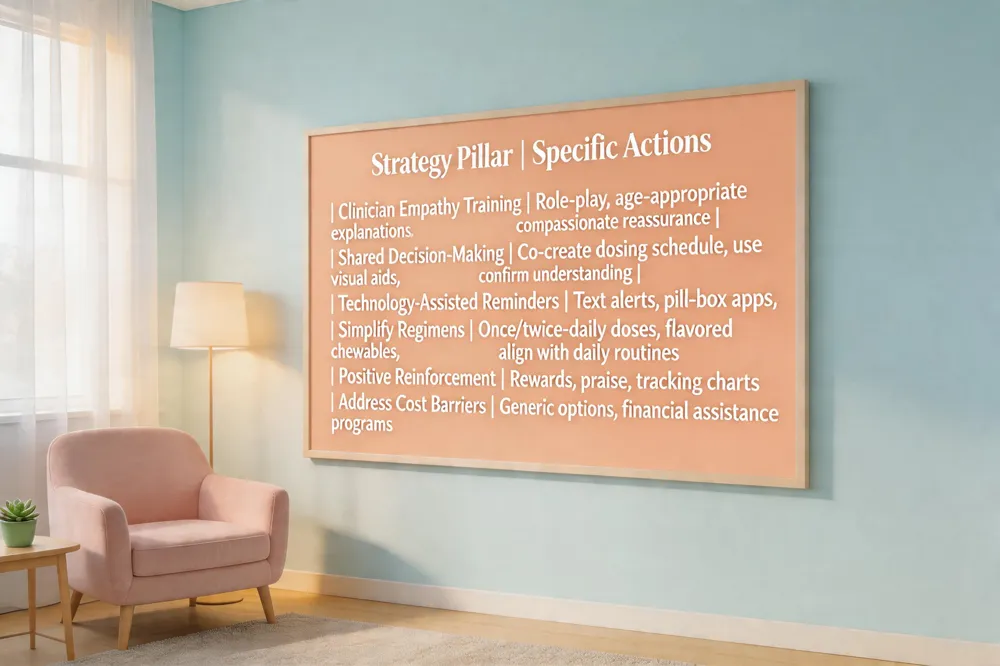 Effective medication adherence in children with chronic illness hinges on three pillars. First, training programs that enhance clinicians’ empathy and communication skills, enable active listening, age‑appropriate explanations, and compassionate reassurance—behaviors that directly increase trust and adherence. Second, shared decision‑making paired with clear, jargon‑free instructions empowers families, reduces anxiety, and ensures that treatment goals align with daily routines. Third, technology‑assisted reminders—such as personalized text alerts, pill‑box apps, and telehealth check‑ins—provide timely prompts while preserving the warm, supportive tone essential for pediatric care.