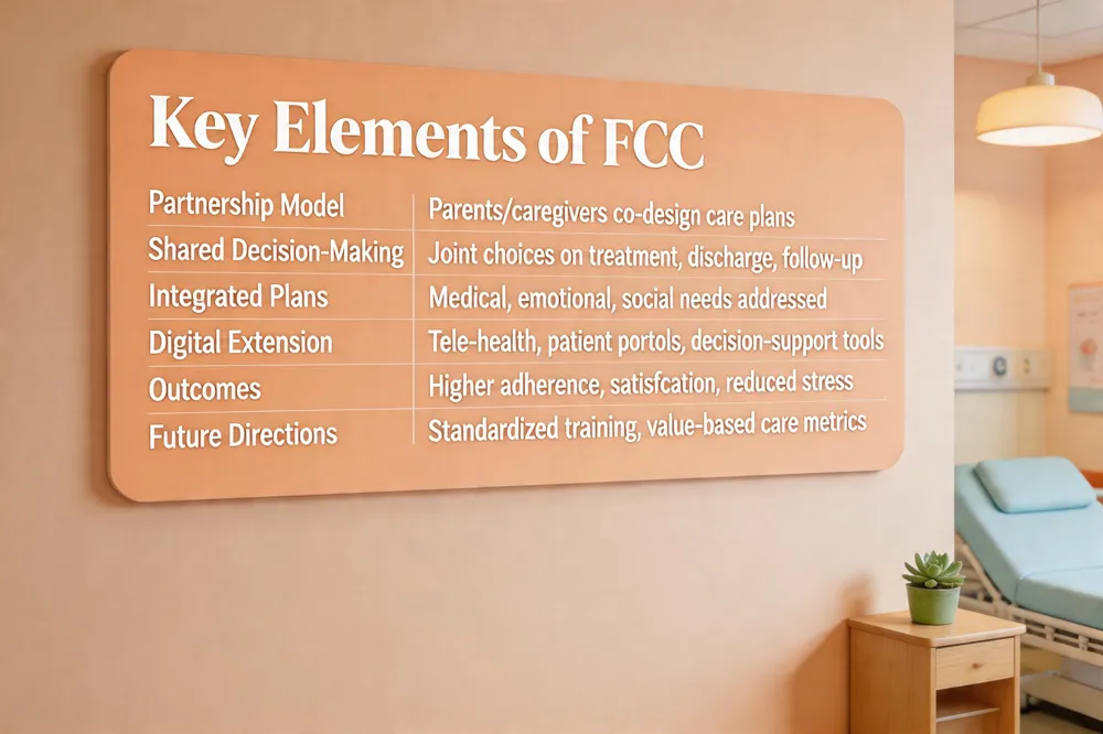 Family‑centered care (FCC) is a partnership model that engages parents and caregivers as active participants in pediatric health‑care decision makingmaking. Current applications include family‑centered rounds, shared‑decision‑making tools, and integrated care plans that address the child’s medical, emotional, and social needs. Evidence shows FCC improves treatment adherence, patient satisfaction, and health outcomes when consistently applied across inpatient and outpatient settings. Future directions emphasize leveraging digital health platforms, telehealth, and data‑driven decision support to extend family involvement beyond the clinic visit. Ongoing research and policy initiatives aim to standardize FCC training, measure its impact on health‑care quality, and embed it within value‑based care models for sustained system‑wide transformation.