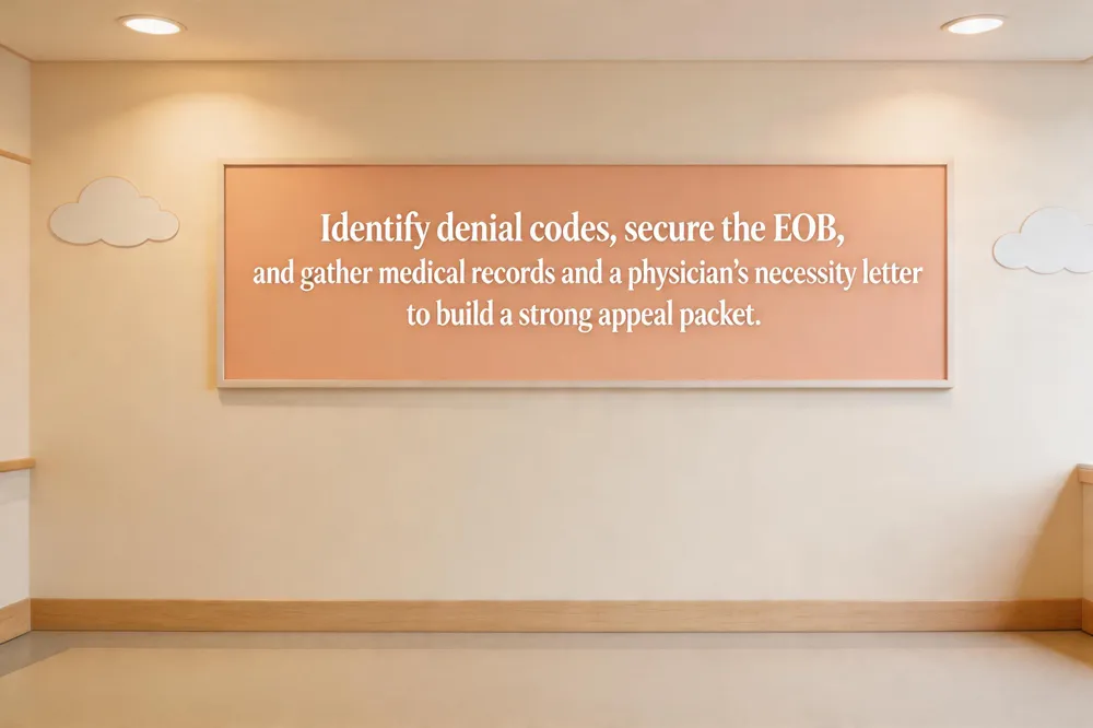 Appeal denied pediatric insurance claims Obtain the EOB, identify the exact denial reason, and gather the child’s diagnosis, treatment plan, physician’s medical‑necessity letter, prior‑authorization records, and relevant clinical guidelines. Write a concise appeal letter that cites the specific policy provision, attaches supporting evidence, and requests a peer‑to‑peer discussion. Submit within the insurer’s internal deadline, keep a communication log, and if denied, file an external review as described above.