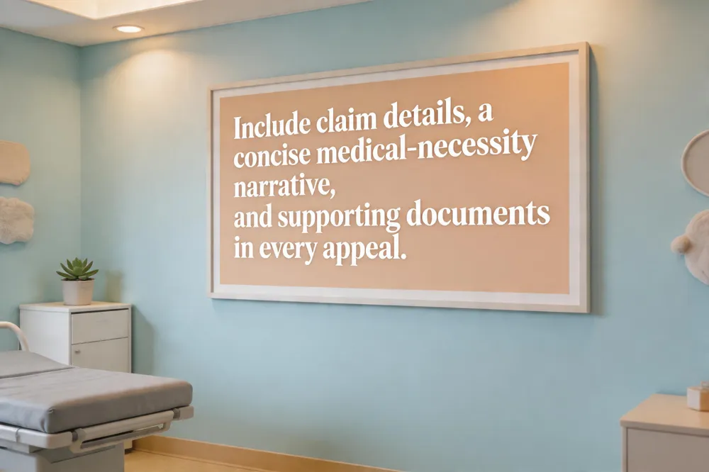 Parents facing a pediatric cardiology denial should include three core elements in every appeal: (1) a clear reference to the denial notice (claim number, date of service, member ID), (2) a concise medical‑necessity narrative that cites the child’s diagnosis, symptoms, and the cardiologist’s recommendation, and (3) supporting documentation (EOB, physician’s letter of medical necessity, recent imaging, guideline excerpts).