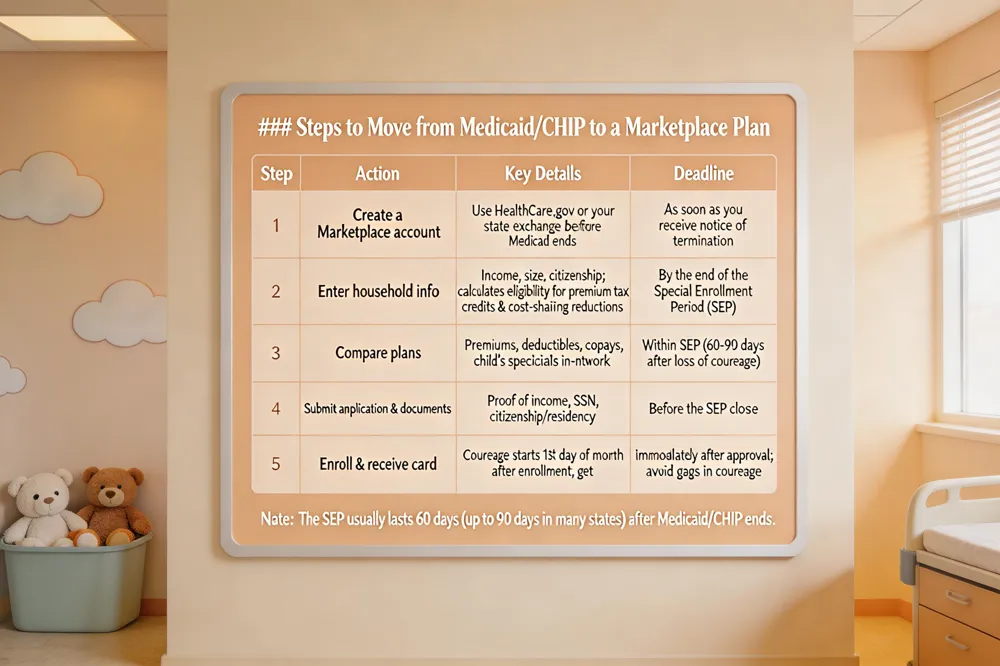 How to transition: 1. Create a Marketplace account at HealthCare.gov or your state’s exchange before your Medicaid ends. 2. Enter household income, size, and citizenship information; the system will tell you if you qualify for premium tax credits or cost‑sharing reductions. 3. Compare plans, focusing on premiums, deductibles, copays, and whether your child’s pediatric cardiology specialists are in‑network. 4. Submit the application with required documents (proof of income, SSN, citizenship). 5. Once approved, the new policy starts on the first day of the month after enrollment, and you’ll receive an insurance card.