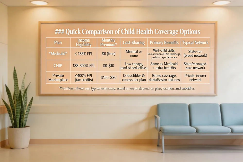 When deciding which health plan best meets a child’s needs, parents should compare Medicaid, CHIP, and private marketplace options. Medicaid, free or low‑cost, is available to families whose income is at or below 138 % of the Federal Poverty Level (FPL) and includes comprehensive benefits such as well‑child visits, immunizations, EPSDT‑required screenings, and pediatric specialty care. CHIP fills the gap for families earning above Medicaid limits—typically up to 200‑300 % of the FPL—offering low premiums and minimal copayments while covering the same essential services. Private plans purchased through the Health Insurance Marketplace may provide a broader provider network and quicker specialist appointments, but they require monthly premiums, deductibles, and cost‑sharing. Eligibility hinges on household income, family size, and state‑specific thresholds, so families should verify limits in Washington State (Apple Health for Medicaid, Apple Health for Kids for CHIP). Provider networks matter: a plan that includes your child’s pediatric cardiology clinic can reduce out‑of‑pocket costs and wait times.