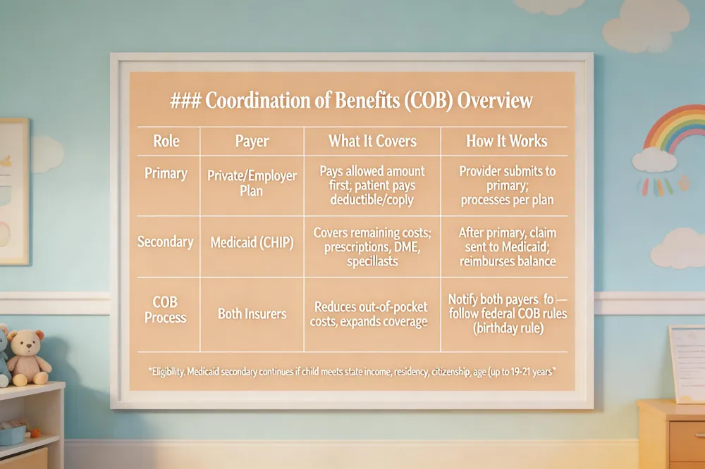 Approximately 10 % of U.S. children—especially those with special health care needs—are dual‑enrolled in private insurance and Medicaid or CHIP, according to CMS and PolicyLab. Coordinating benefits lets the private plan pay first while Medicaid (or CHIP) covers remaining eligible costs, reducing out‑of‑pocket expenses, filling gaps for services such as home nursing, transportation, and adaptive equipment, and ensuring continuity of care for complex conditions like pediatric cardiology. However, claim denials can arise if families fail to update private‑insurance information with Medicaid, neglect to provide the Coordination ofof‑Benefits (COB) form, or attempt to bill services that are already covered. To avoid denials, keep insurance cards current, submit claims to the primary payer first, verify network participation, and work with the practice’s billing staff to confirm that Medicaid is listed as secondary when appropriate.