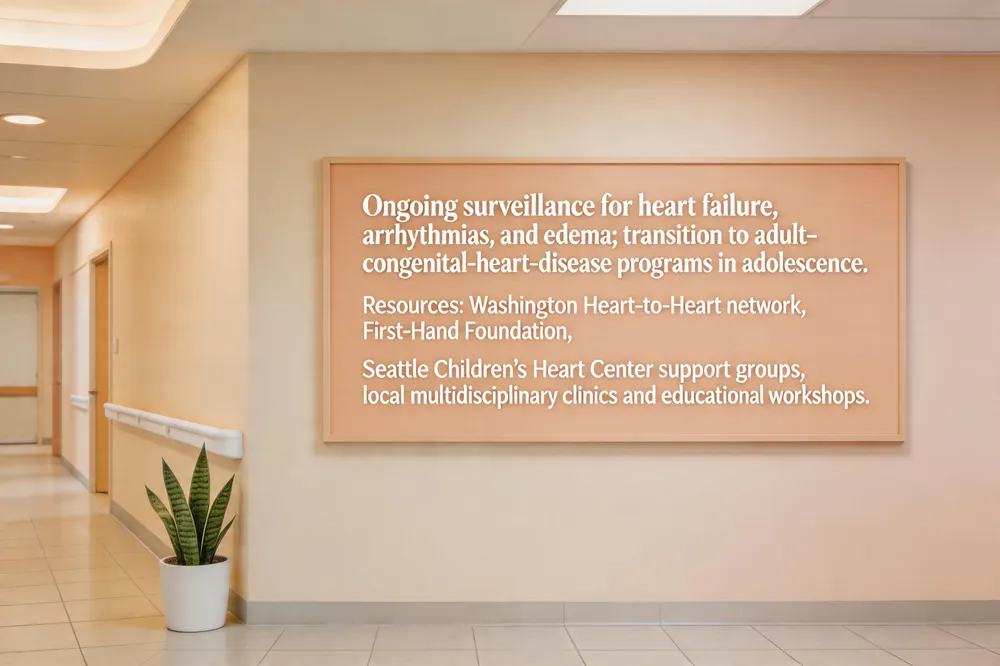Children who have been treated for a congenital heart defect need ongoing surveillance to catch early signs of heart failure and arrhythmias. Parents should watch for swelling in the feet, ankles, abdomen or neck veins, rapid breathing, wheezing, persistent coughing, poor feeding, excessive sweating during feeds, fatigue, irritability, weight loss or fainting spells. Any of these findings merit prompt evaluation by a pediatric cardiologist. As the child approaches adolescence, a structured transition to an adult‑congenital‑heart‑disease program is essential; the team reviews medical history, imaging, medications and plans for lifelong care. In Washington State, families can access the Heart‑to‑Heart network, the First Hand Foundation, and the Seattle Children’s Heart Center’s support groups, which provide counseling, financial assistance and peer connections. Local clinics in Seattle, Tacoma and Spokane also offer multidisciplinary cardiac clinics and educational workshops to empower caregivers throughout the journey. These resources aid families with insurance matters.