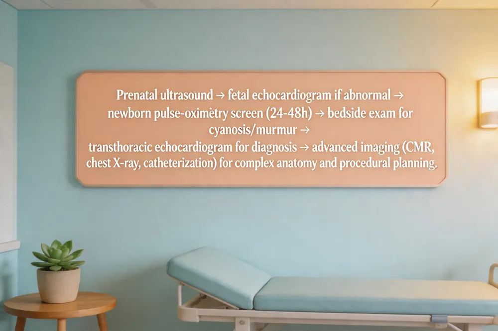 If the screen or exam raises concern, a transthoracic echocardiogram is ordered. This non‑invasive ultrasound provides a real‑time view of heart structure, valve function and blood flow, confirming the diagnosis and grading severity. In more complex cases, cardiac magnetic resonance imaging, chest X‑ray or cardiac catheterization may be added to clarify anatomy, assess pressures and guide surgical or catheter‑based planning.