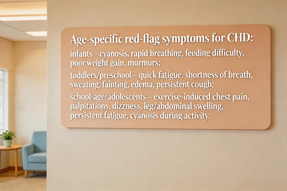 School‑age and adolescent signs – From 6 years onward, watch for exercise‑induced chest discomfort or chest pain, palpitations (racing or irregular heartbeat), dizziness or fainting after exertion, and swelling of the legs or abdomen. Persistent fatigue, shortness of breath during sports, and a bluish tint to lips or gums during activity are red‑flag symptoms.