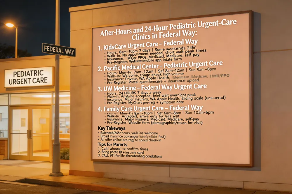 Federal Way families have several convenient after‑hours and 24‑hour pediatric urgent‑care resources that keep non‑life‑threatening illnesses and injuries out of the emergency department.