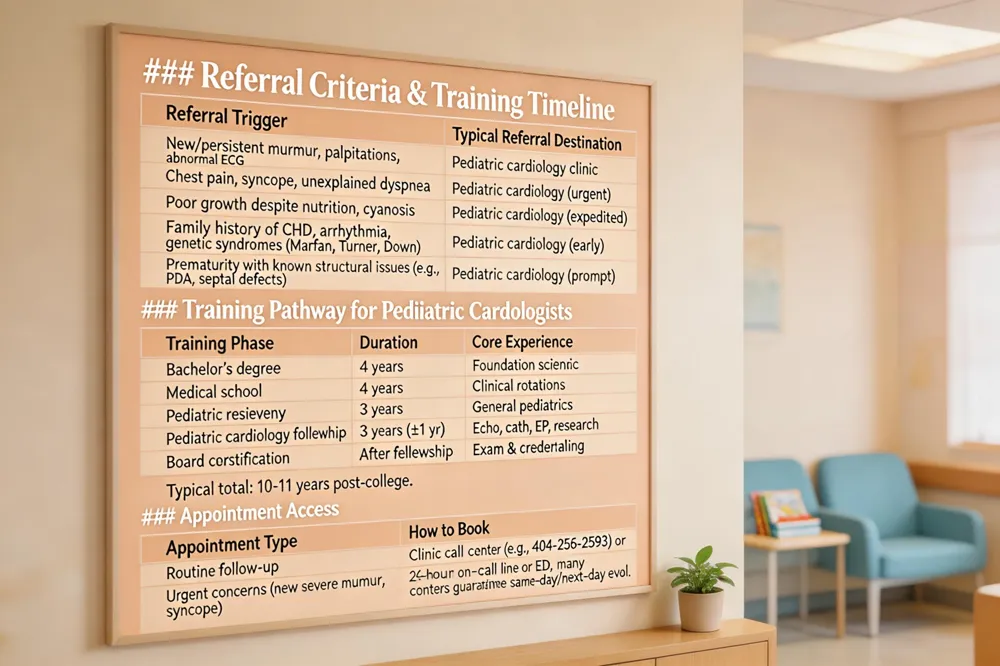 | Why would my child be referred to a pediatric cardiologist? A pediatric cardiologist is consulted when a child shows signs that suggest a heart problem, such as a new or persistent murmur, palpitations, irregular rhythms, or an abnormal ECG. Red‑flag symptoms include chest pain, fainting, shortness of breath, poor growth despite adequate nutrition, or cyanosis. Children with high blood pressure, a family history of congenital heart disease or arrhythmia, or genetic conditions that affect the heart (e.g., Marfan, Turner, Down syndrome) also warrant referral. Infants born prematurely or with known structural issues like patent ductus arteriosus, septal defects, or unexplained cyanosis need prompt evaluation. Referral can often be scheduled within a week, but urgent appointments are arranged for any child who appears hemodynamically unstable or at risk for rapid deterioration. |