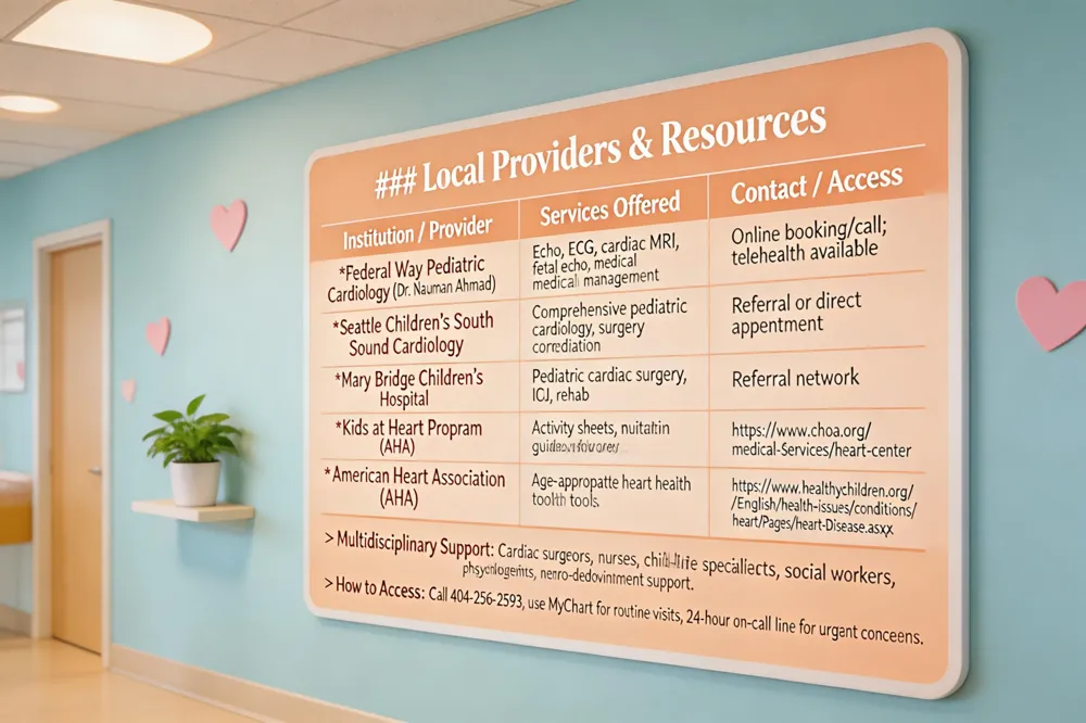 Parents in Federal Way, WA have several high‑quality options for pediatric cardiology. The Federal Way Pediatric Cardiology clinic, led by board‑certified Dr. Nauman Ahmad, offers comprehensive diagnostic services—including echocardiograms, ECGs, cardiac MRI, and fetal echo—alongside medical management and coordination with regional centers such as Seattle Children’s South Sound Cardiology and Mary Bridge Children’s Hospital. Appointments can be booked online or by calling the clinic’s office, and the practice provides telehealth visits for routine follow‑ups, reducing travel burden for families.
