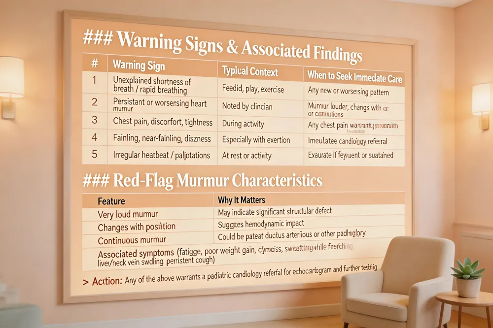 Parents should watch for five key warning signs that may indicate underlying heart disease in a child: (1) unexplained shortness of breath or rapid breathing during feeding, play, or exercise; (2) a persistent or worsening heart murmur noted by a clinician; (3) chest pain, discomfort, or tightness during activity; (4) fainting, near‑fainting, or unexplained dizziness, especially with exertion; and (5) irregular heartbeat or palpitations at rest or during activity. While most murmurs are innocent, urgent evaluation is needed when a murmur is unusually loud, changes with position, is heard continuously, or is accompanied by fatigue, poor weight gain, excessive sweating while feeding, cyanosis, chest pain, dizziness, swelling of the liver or neck veins, or a persistent cough. Parents can monitor their child’s heart health by noting any changes in breathing patterns, activity tolerance, growth trends, and skin color, and by scheduling regular pediatric check‑ups that include heart rate and blood pressure screening. If any red‑flag symptoms appear, a prompt referral to a pediatric cardiologist for an echocardiogram and further testing is essential.