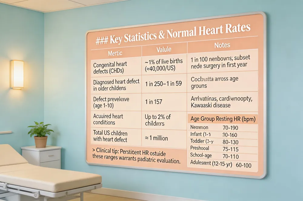How common are heart problems in children? Congenital heart defects (CHDs) are the most common birth defect, affecting about 1 % of live births in the United States (≈40,000 babies each year). This translates to roughly 1 in 100 newborns, with a critical subset requiring surgery in the first year. Among older children, CDC data show that between 1 in 250 and 1 in 59 have a diagnosed heart defect, and about 1 in 157 children aged 1‑10 years have a documented defect. Acquired conditions such as arrhythmias, cardiomyopathy, or Kawasaki disease are less frequent but can affect up to 2 % of children. Overall, about 1 million U.S. children live with a heart defect, underscoring the need for early detection and specialized pediatric cardiology care.