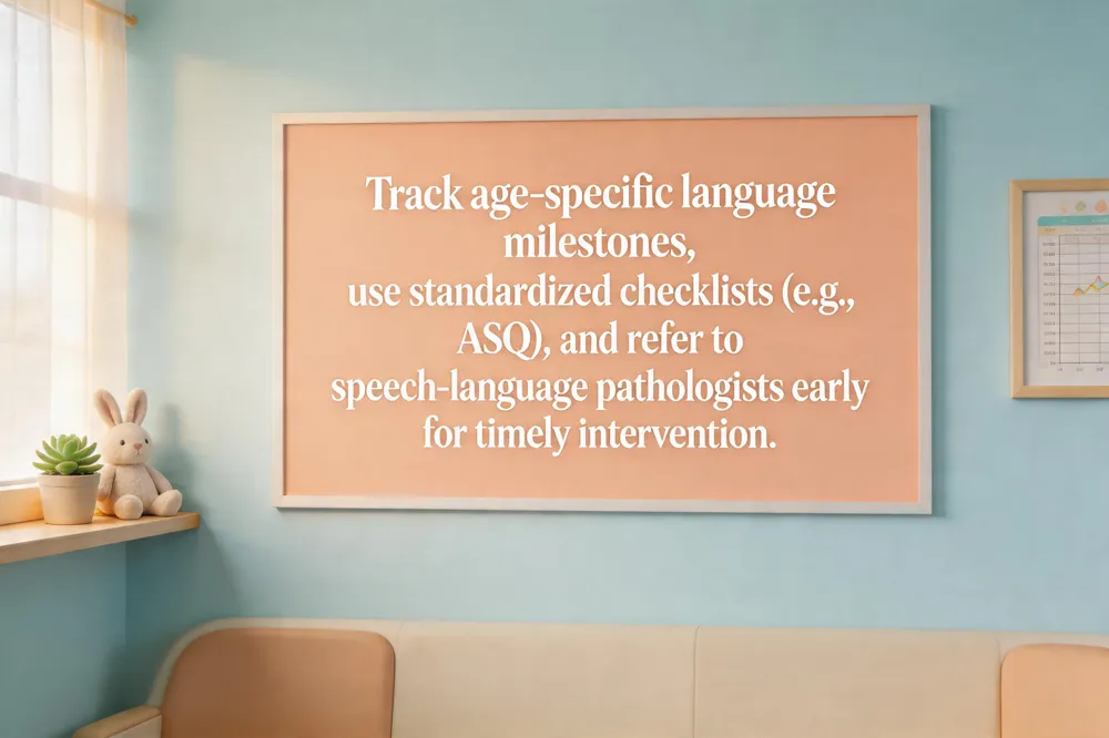 Referral pathways to speech‑language pathologists When a child screens positive for delay, the pediatrician arranges a timely referral to a certified speech‑language pathologist (SLP). The SLP conducts a comprehensive assessment, may coordinate hearing tests, and develops a home‑based language‑rich plan (e.g., narrating daily activities, turn‑taking, expansion techniques). Early referral—ideally before age three—improves academic and social‑emotional outcomes.
