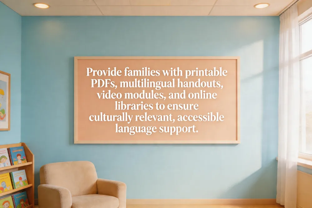 Multilingual educational videos – AI‑driven translation platforms (e.g., GPT‑4 powered) produce native‑accent narrated videos that demonstrate caregiver‑child interaction, play‑based language stimulation, and early‑delay detection. These videos can be streamed in the clinic or shared via patient portals, ensuring families with limited English proficiency receive culturally relevant guidance.