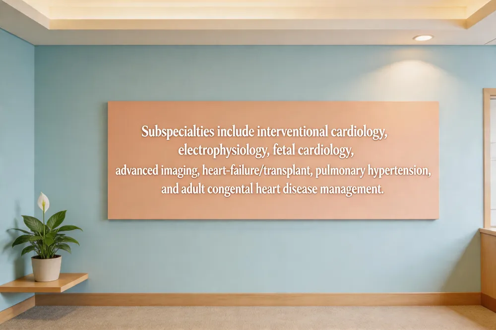 What subspecialties exist within pediatric cardiology? Key areas include interventional cardiology, electrophysiology, fetal cardiology, advanced cardiac imaging, heart‑failure/transplant, pulmonary‑hypertension, and adult congenital heart disease, all delivered by multidisciplinary teams.