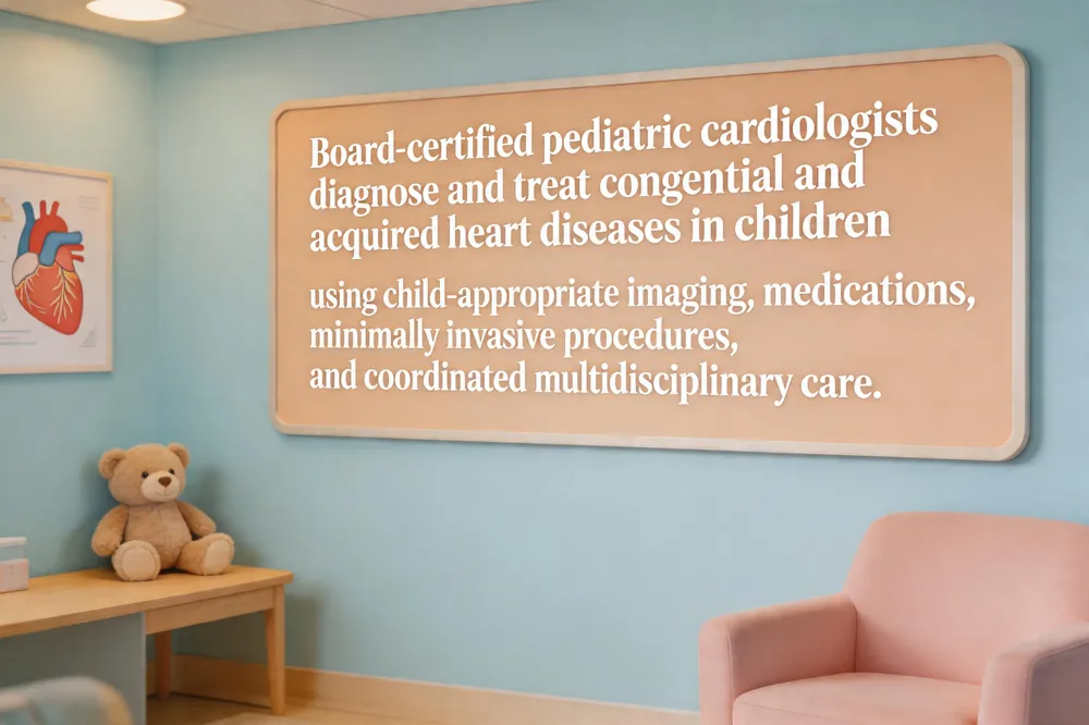 Board‑certified pediatric cardiologists are physicians who have completed a pediatric residency and a minimum three‑year fellowship in pediatric cardiology, confirming expertise in the unique anatomy, physiology, and disease patterns of children’s hearts. They diagnose and treat a wide spectrum of pediatric heart disease, from congenital heart defects present at birth to arrhythmias, cardiomyopathy, hypertension, and acquired conditions that arise later in childhood. Using child‑appropriate diagnostic tools—such as echocardiography (including fetal echo), electrocardiograms, cardiac MRI, CT, and cardiac catheterization— they obtain accurate images and functional data without unnecessary radiation exposure.