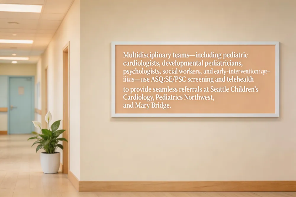 Pediatric cardiology clinics in Federal Way weave social‑emotional monitoring into every well‑child visit using tools such as the ASQ:SE and PSC to catch early signs of anxiety, peer‑relationship challenges, or caregiver stress. A multidisciplinary team—pediatric cardiologists, developmental pediatricians, child psychologists, social workers, and early‑intervention specialists creates a seamless referral pathway so children receive counseling, play therapy, or speech‑language services without delay. Family‑centered care models empower parents with anticipatory guidance on emotional regulation, sleep hygiene, and responsive caregiving, while telehealth visits expand access to psychosocial support for families living farther from the clinic.