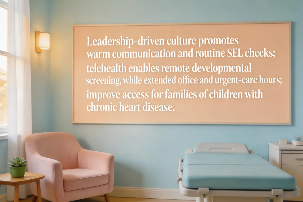 Champion leadership and office‑culture shifts are essential for making social‑emotional health a routine part of pediatric care. When a clinician or administrator models warm, respectful communication, staff adopt the same approach, creating a practice environment where families feel safe sharing concerns about their child’s emotions and behavior. This culture change also supports the integration of telehealth, which has expanded dramatically since COVID‑19 and now allows pediatricians to conduct brief developmental checks, review ASQ:SE or PSC results, and coach parents on emotion‑labeling and coping strategies without a trip to the clinic. In Federal Way, extended office hours and urgent‑care integration further improve access—well‑child visits, vaccination appointments, and same‑day cardiac follow‑ups can be scheduled early mornings, evenings, or weekends, ensuring that children with chronic heart disease receive coordinated medical and psychosocial monitoring.