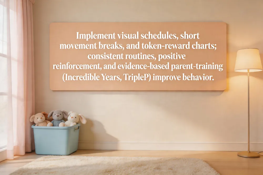 How to treat ADHD child at home – Begin with a predictable routine, visual supports, balanced meals, limited screen time, and sufficient sleep. Apply positive‑behavior strategies and reward charts, and enroll in evidence‑based parent‑training programs (e.g., Incredible Years, Triple P) that teach effective discipline and communication. Keep regular follow‑up with your pediatrician or child‑psychologist to monitor progress and discuss school accommodations or medication if needed.