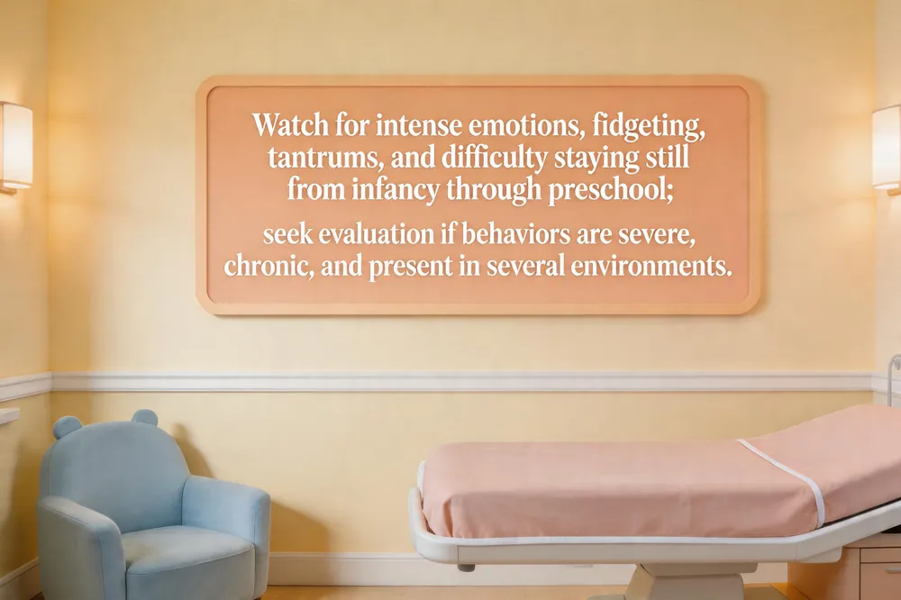 Infant & Toddler Warning Signs – Even at 12 months, unusually intense, poorly‑regulated emotions, chronic crying, difficulty self‑soothing, restless fidgeting while seated, and sleep‑feeding challenges may signal risk. At age 2, extreme tantrums, inability to calm down, constant climbing, impulsive grabbing, and persistent need for stimulation become more apparent.