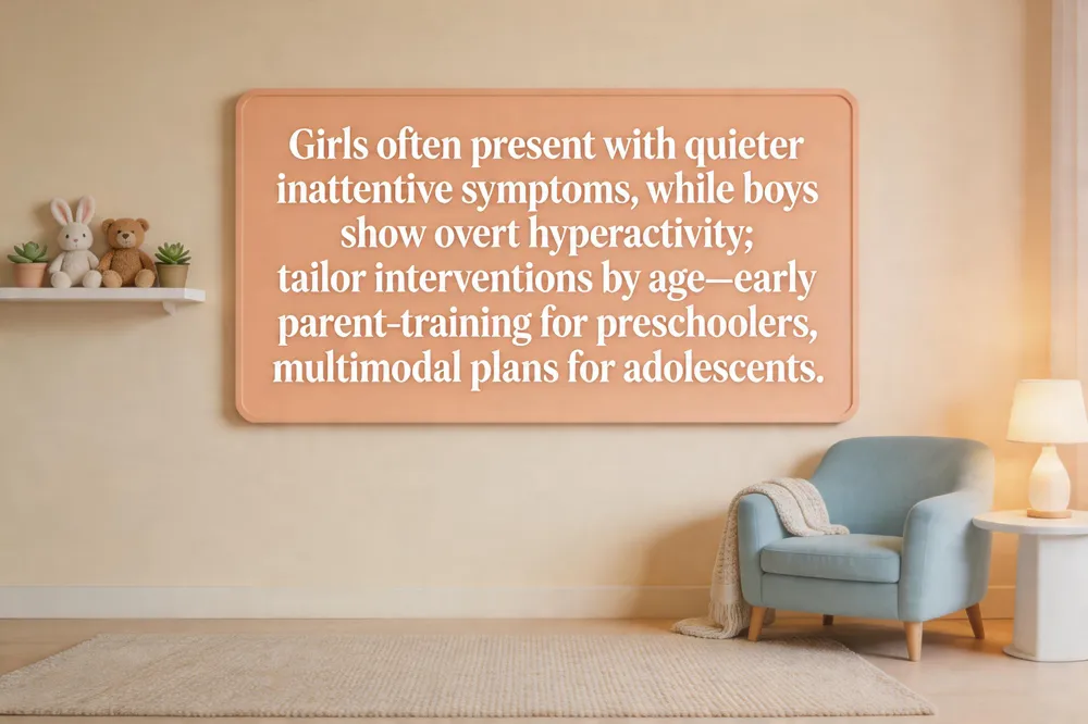 Girls vs. boys presentation – Girls often display quieter inattentive signs (day‑dreaming, losing items, difficulty following simple directions) while boys tend to be more overtly hyperactive (constant fidgeting, running, excessive talking). Both sexes must show symptoms in at least two settings for a diagnosis.