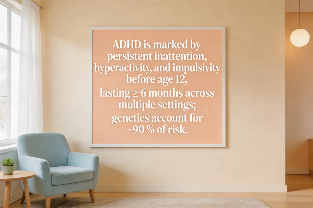ADHD is a neurodevelopmental disorder marked by persistent inattention, hyperactivity, and impulsivity that must appear before age 12, last at least six months, and be evident in multiple settings (home, school, or other environments). Children with the inattentive type often make careless mistakes, lose items, daydream, and struggle to follow instructions. Hyperactive‑impulsive children fidget, can’t stay seated, run or climb inappropriately, talk excessively, and act without thinking, frequently interrupting others. Boys typically display overt hyperactivity and impulsivity, while girls more often show quieter inattentive symptoms and internalizing issues such as anxiety or low self‑esteem, which can delay recognition. Genetics dominate the disorder’s etiology—studies estimate that roughly 90 % of ADHD risk is inherited, with environmental factors contributing only a modest share. Because ADHD runs in families, a comprehensive evaluation—including parent‑teacher input, standardized rating scales, and medical history—is essential for accurate diagnosis and early, family‑centered intervention.