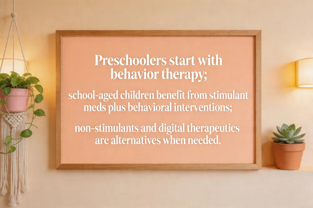 Current pediatric guidelines, such as those from the American Academy of Pediatrics, recommend a multimodal approach to ADHD. For preschool‑aged children (4‑5 years), behavior‑therapy—especially parent‑training programs like Incredible Years or Triple P is the first‑line treatment; medication is reserved for cases with persistent, severe impairment. In school‑aged children (6‑12 years) and adolescents, stimulant medications (methylphenidate or amphetamine formulations) remain the most effective pharmacologic option, delivering the greatest reduction in core symptoms. Non‑stimulants (atomoxetine, guanfacine, clonidine) are used when stimulants are ineffective, poorly tolerated, or contraindicated. Combining medication with evidence‑based behavioral interventions (parent training, classroom accommodations, organizational skills training) yields the strongest outcomes, improving attention, academic readiness, and social functioning. Research consistently shows that integrated therapy outperforms medication or behavior therapy alone, and ongoing studies are evaluating digital therapeutics and novel agents to further personalize care. Regular monitoring of growth, cardiovascular health, and side effects is essential for safe, long‑term management.