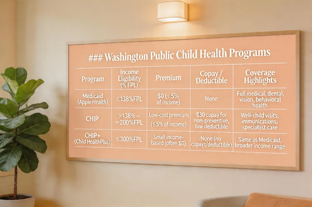 Washington’s Medicaid (Apple Health) provides full‑coverage medical, dental, vision, and behavioral‑health services for children in low‑income families, with no copays, deductibles or out‑of‑pocket maximums, beyond the modest premium cap of 5 % of family income. CHIP (Children’s Health Insurance Program) serves families whose earnings are too high for Medicaid but too low for private plans; it offers routine well‑child visits, immunizations and specialist care with typically a $30 copay for non‑preventive services and a low deductible that may apply to specialty procedures such as pediatric cardiology. CHIP+ (Child Health Plus) is Washington’s low‑cost option for children up to about 300 % of the federal poverty level; unlike Medicaid it may require a small income‑based premium but has no copays, coinsurance or deductible. Out‑of‑pocket limits are capped at 5 % of household income for both programs, protecting families from catastrophic costs.