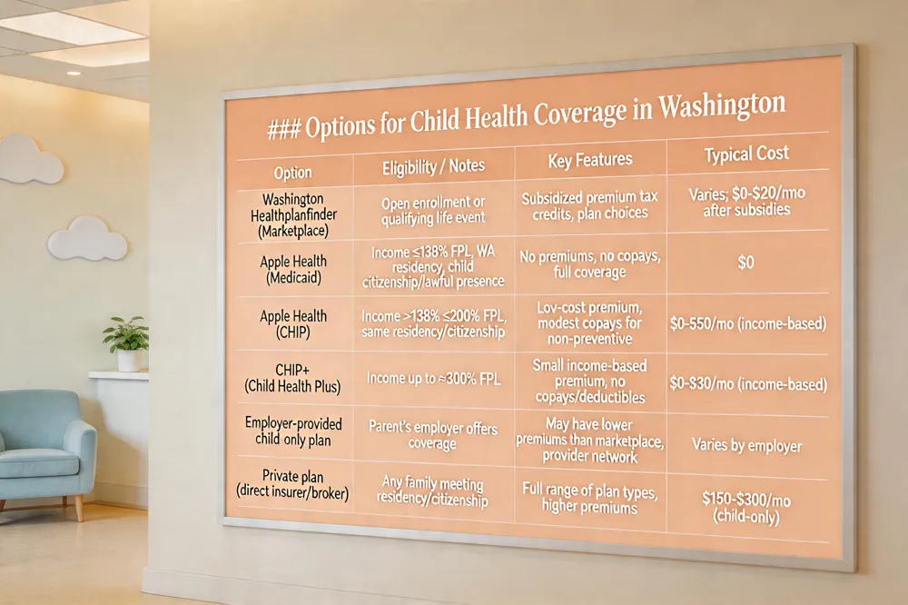 How can families find the most affordable health‑insurance options for children? Start by checking Apple Health eligibility online, then compare subsidized marketplace plans on Washington Healthplanfinder. Review employer‑offered child‑only coverage, and consult the pediatric office’s billing staff for in‑network provider guidance to minimize out‑of‑pocket expenses.