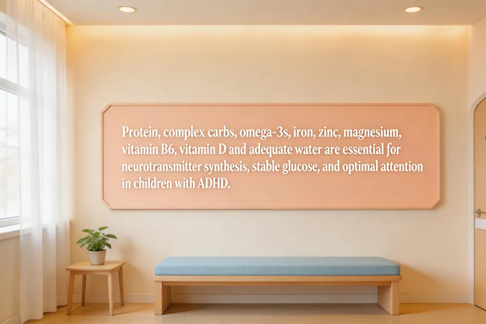 Research on specific nutrients: Omega‑3 fatty acids (EPA/DHA) modestly improve attention and reduce hyperactivity; Protein‑rich foods support dopamine synthesis; adequate zinc, iron, magnesium, vitamin D, and B‑vitamins are linked to better symptom control when deficient. Supplements help only when a documented deficiency exists.
