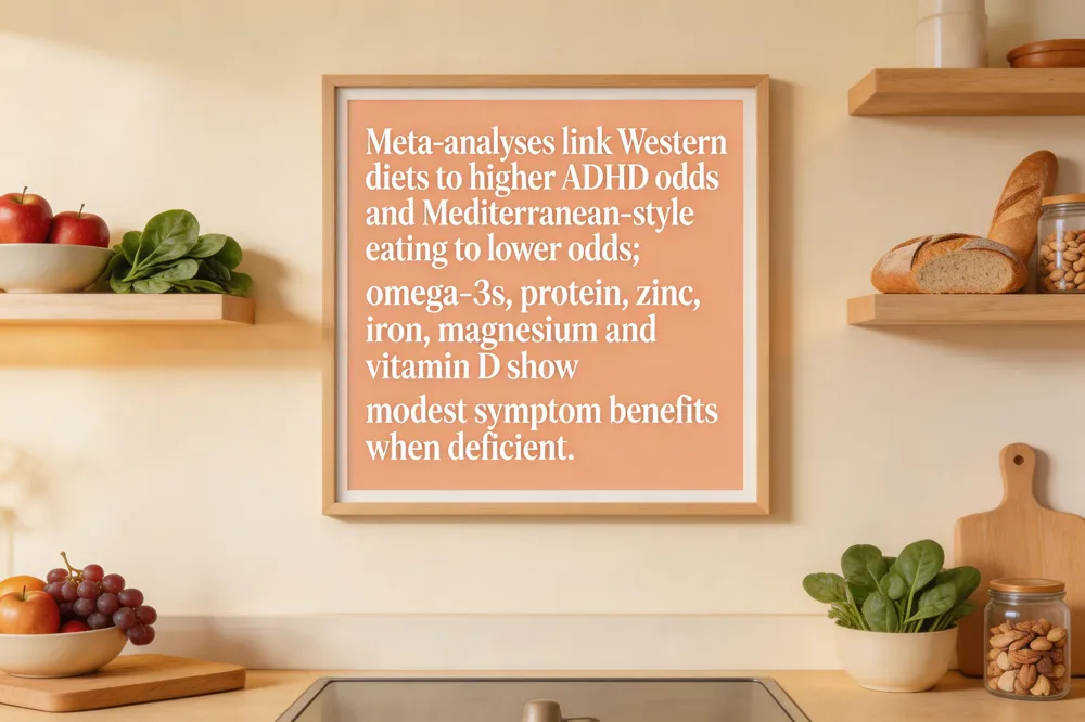 Meta‑analyses of dietary patterns: Large‑scale reviews show unhealthy Western diets (high saturated fat, refined sugar) raise ADHD odds by ~40 % (OR ≈ 1.4), whereas Mediterranean‑style eating (fruits, vegetables, whole grains, omega‑3s) lowers odds by ~35 % (OR ≈ 0.65). Observational data drive these findings; randomized trials are limited, so causality remains uncertain.