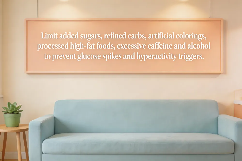 - Foods to avoid with ADHD adults: Limit added‑sugar treats, refined carbs, processed fast foods, excessive caffeine, and alcohol.