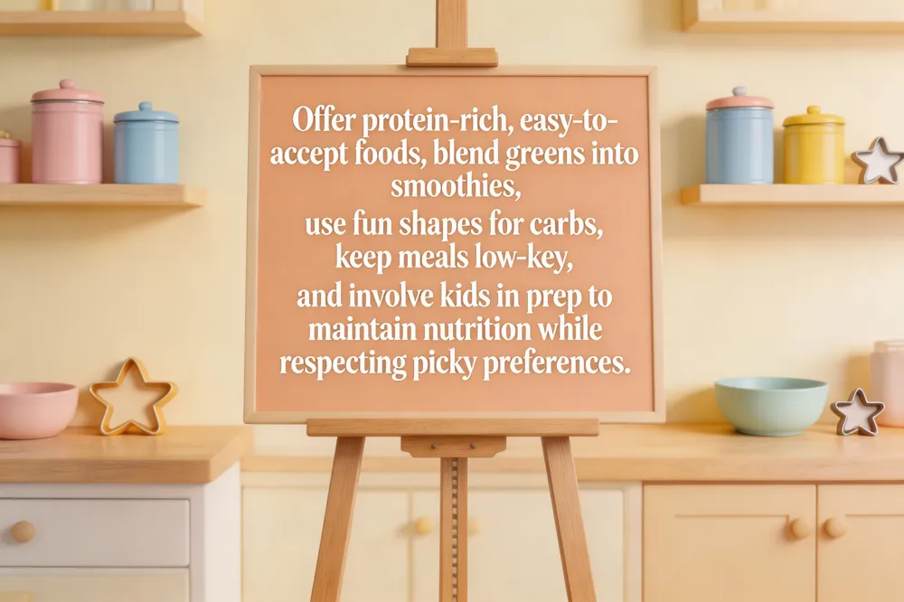 ADHD diet for picky eaters – Focus on nutrient‑dense foods that are easy to accept. Offer high‑protein options such as eggs, cheese, beans, or lean meats at breakfast and snack times. Blend leafy greens into smoothies or sauces so they’re unnoticed. Include omega‑3‑rich foods like salmon, walnuts, or a daily fish‑oil supplement. Serve complex carbs (whole‑grain breads, fruit, vegetables) in fun shapes or with tasty dips. Keep mealtimes low‑key, turn off screens, respect hunger cues, and involve the child in grocery shopping or simple prep. If gaps remain, a chewable multivitamin or pediatric‑specific supplement can fill missing nutrients.