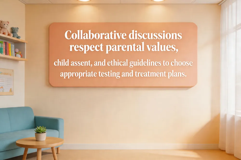 The American Academy of Pediatrics (AAP) consensus recommendations emphasize that shared decision‑making is the cornerstone of pediatric care. Clinicians must protect the child’s health interests while honoring parental discretion, guided by ethical standards such as the Best‑Interest Standard, Diekema’s Harm Principle, and Ross’s Constrained Parental Authority. When a child is developmentally capable, clinicians should seek assent, explaining options in age‑appropriate language and respecting the child’s perspective. Parents’ choices are shaped by hopes for a definitive diagnosis, worries about risks or discrimination, cultural values, practical concerns like insurance coverage, and emotional states such as anxiety or relief. Ultimately, families must balance the child’s best‑interest with family values, using clear communication and collaborative planning to arrive at testing and treatment decisions that support optimal health outcomes.